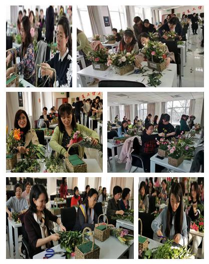 活动中,邀请花艺师给大家讲授插花知识,从花材、容器、色彩搭配等方面,详细介绍了插花的艺术造型要素和技巧手法,并在现场做了生动的演示。活动现场花香四溢,充满着春天的气息,大家兴致盎然,纷纷跃跃欲试,边看边学,享受着亲自创作的乐趣和插花艺术带来的快乐。整个活动最精彩、最令人期待的环节是由女同胞们创作一篮属于自己的花束,一支支粉玫瑰、香水百合、康乃馨、洋甘菊,经过女同胞们的巧手修枝剪叶、搭配色彩,细致地置入花篮,一盆盆错落有致、色彩鲜艳、造型各异的插花作品展现在大家面前,寄托了大家对美的理解和对幸福的感悟。看着通过自己双手制作成的插花作品,大家的脸上都洋溢着喜悦的笑容。