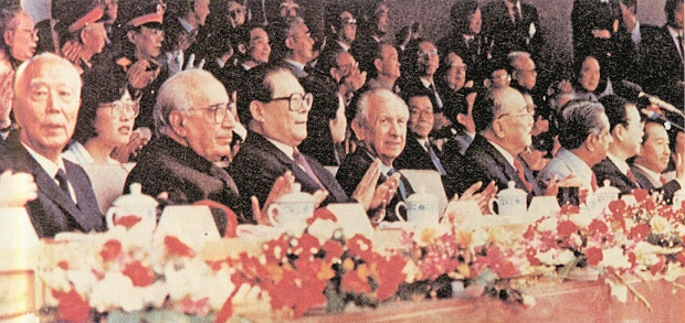 党和国家领导人江泽民、杨尚昆、李鹏、万里同国际奥委会主席萨马兰奇(前排左四)、巴基斯坦总统伊沙克·汗(前排左二)在第11届亚运会主席台上