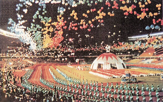 1990年9月22日下午,来自“世界屋脊”青藏高原上的念青唐古拉山脉主峰的亚运圣火,在北京工人体育场点燃,从而拉开了亚洲史上空前规模的体坛盛会的帷幕。在开幕式上,大型团体操表演《相聚在北京》以其磅礴的气势和壮观的场面,向现场7万多名中外观众展示了中华民族的灿烂文化和中国人民的崭新精神面貌。