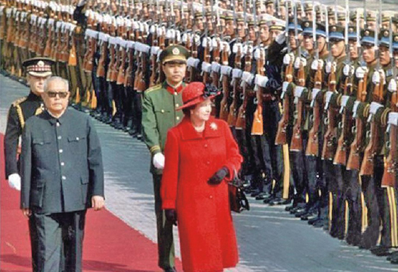 1986年10月,英国女王伊丽莎白二世访问中国,要求乘坐红旗轿车。图为国家主席李先念陪同女王检阅仪仗队