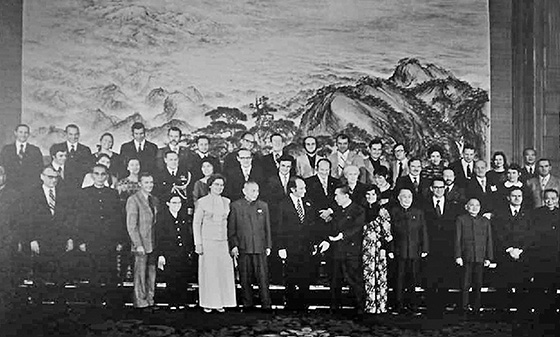1973年10月11日,中国多位领导人与特鲁多及夫人一行在北京合影