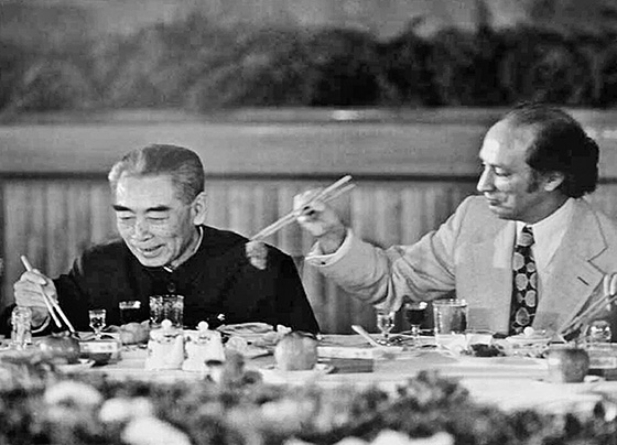 1973年10月12日,在人民大会堂举行的宴会中,特鲁多学着使用筷子,并给周恩来夹菜
