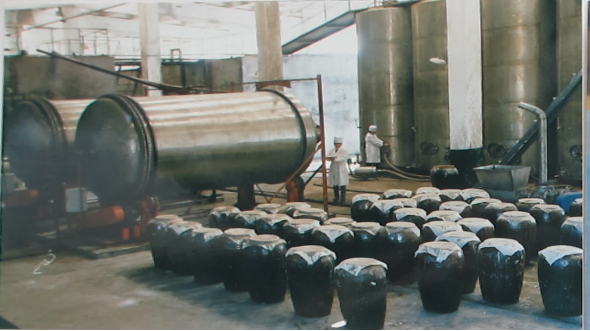 1984年宁夏玉泉营葡萄酒厂在国家轻工部葡萄酒专家的直接指导下建成投产。图为葡萄干红酒旋转发酵生产线