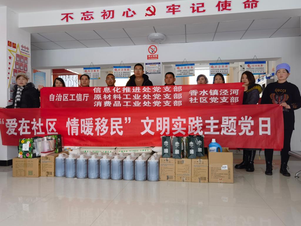 为落实厅党组要求,积极把党史学习教育成果转化为为群众办实事的实际行动,与机关处室一起做好社区移民困难群众关心关爱工作,驻泾河社区工作队认真开展入户走访,摸清移民困难群众底数,聚焦移民中“三类”监测帮扶对象,重病重残人员和特殊困难家庭等重点人群。1月23日,牵头组织厅信息化推进处、原材料工业处、消费品工业处党支部与香水镇泾河社区党支部联合开展“爱在社区·情暧移民”文明实践主题党日活动,联合树根互联技术有限公司、宁夏建龙龙祥钢铁有限公司、宁夏明德中药饮片有限公司开展扶贫助困送温暖联建活动。