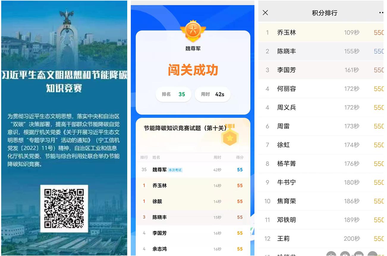 开展一次知识竞赛。利用微信小程序,设计开展了“习近平生态文明思想和节能降碳知识竞赛”,通过竞赛闯关和抽奖竞答,引导党员干部深入学习。全厅共有176人参加知识竞赛,145人顺利通关。知识竞赛丰富了学习形式,增强了学习活动趣味性,也有效提高了党员干部对习近平生态文明思想相关知识的知晓度,取得了较好的学习效果。