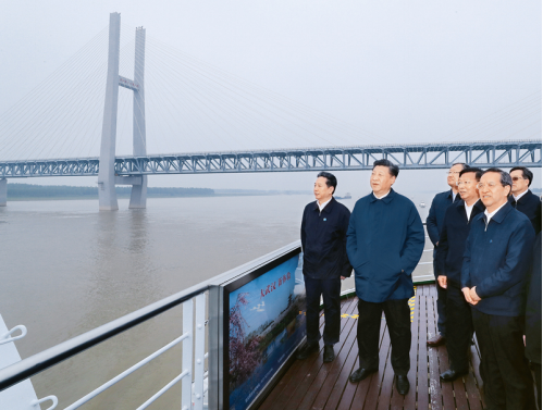2018年4月26日下午,中共中央总书记、国家主席、中央军委主席习近平在武汉主持召开深入推动长江经济带发展座谈会并发表重要讲话。这是座谈会前,习近平于25日上午乘船沿江察看两岸生态环境和发展建设情况。 新华社记者 谢环驰/摄