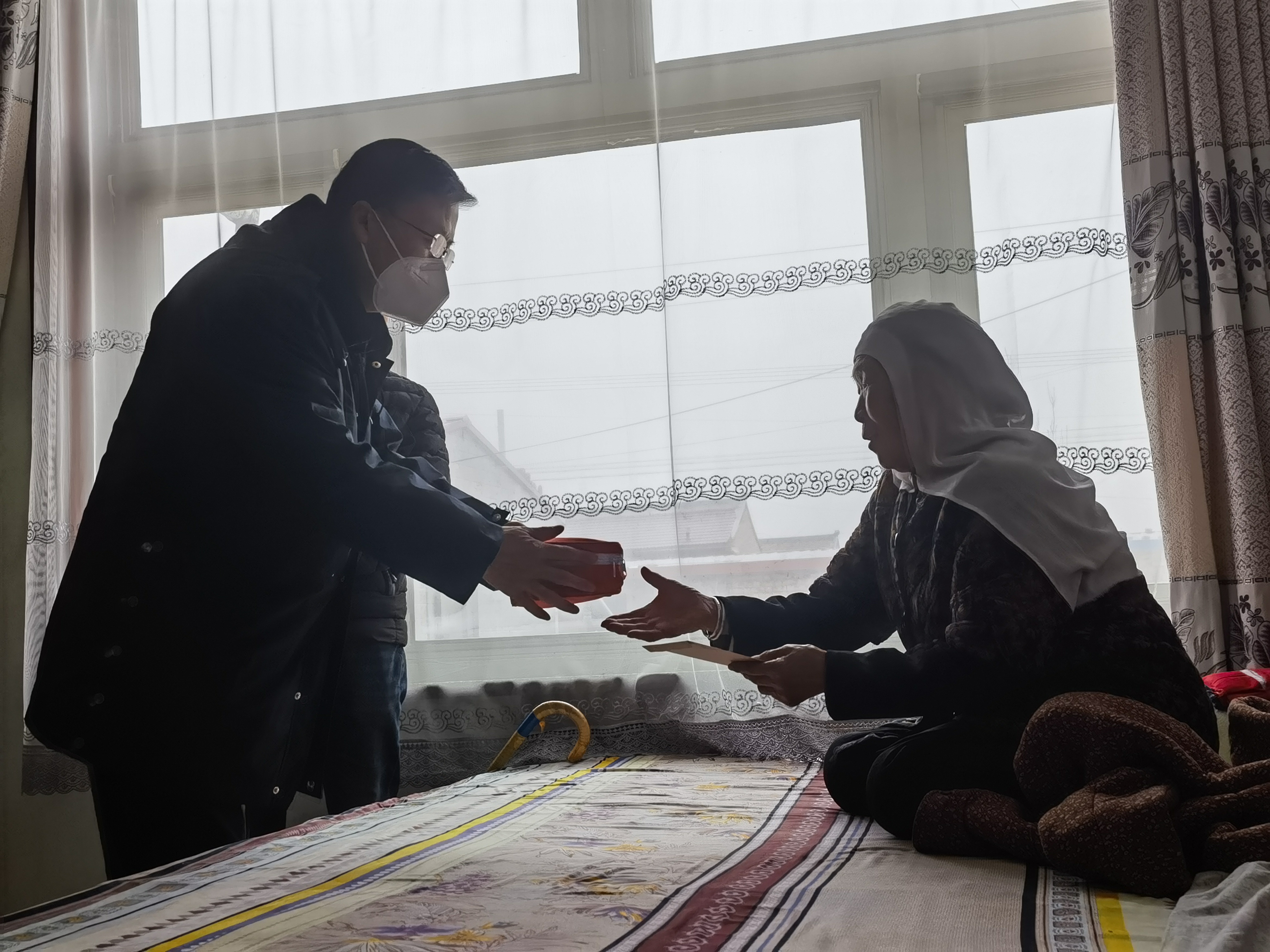 每到一户,刘红宁同志都要向困难群众送上慰问金、慰问品和防疫健康包,传递党组织对困难群众的关心关爱,并致以节日问候与祝福;详细询问了解经济收入、社会帮扶、扶贫政策落实情况和存在的困难,叮嘱、鼓励他们要保重身体,坚定信心,坚持走产业发展致富路子,相信日子一定会越来越好。