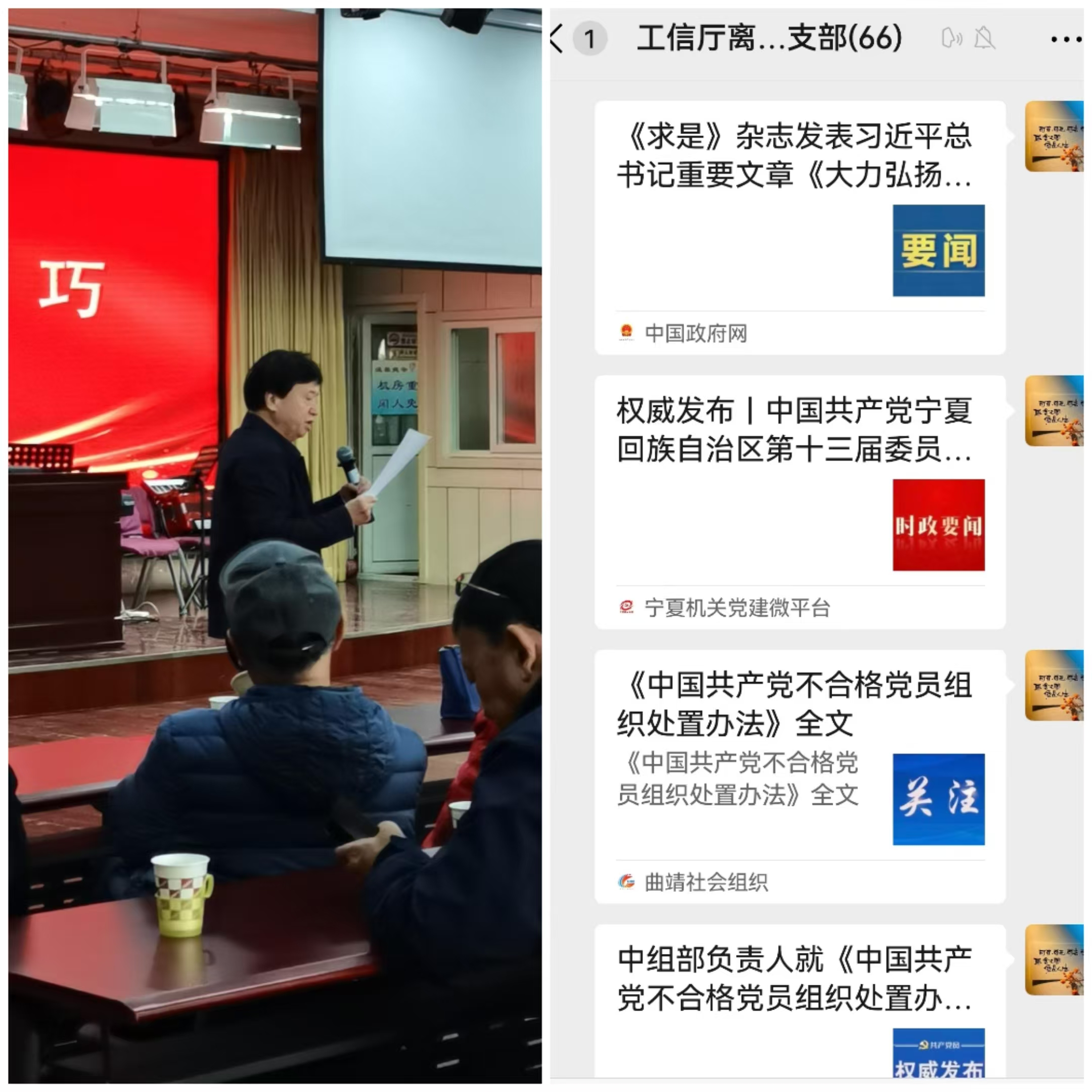 活动传达学习了习近平总书记重要文章《大力弘扬伟大爱国主义精神,把强国建设、民族复兴伟业不断推向前进》、中国共产党宁夏回族自治区第十三届九次全体会议公报、《中国共产党不合格党员组织处置办法》,进一步引导离退休党员、干部职工大力弘扬伟大爱国主义精神,时刻牢记党员身份和使命,严格自我要求、提高党性修养,确保在思想上、行动上始终与党中央保持高度一致。离退休党员干部纷纷表示,要退休不退色,持续强化理论学习,不断强化纪律意识、加强自我约束、提高免疫能力,保持党的先进性和纯洁性。