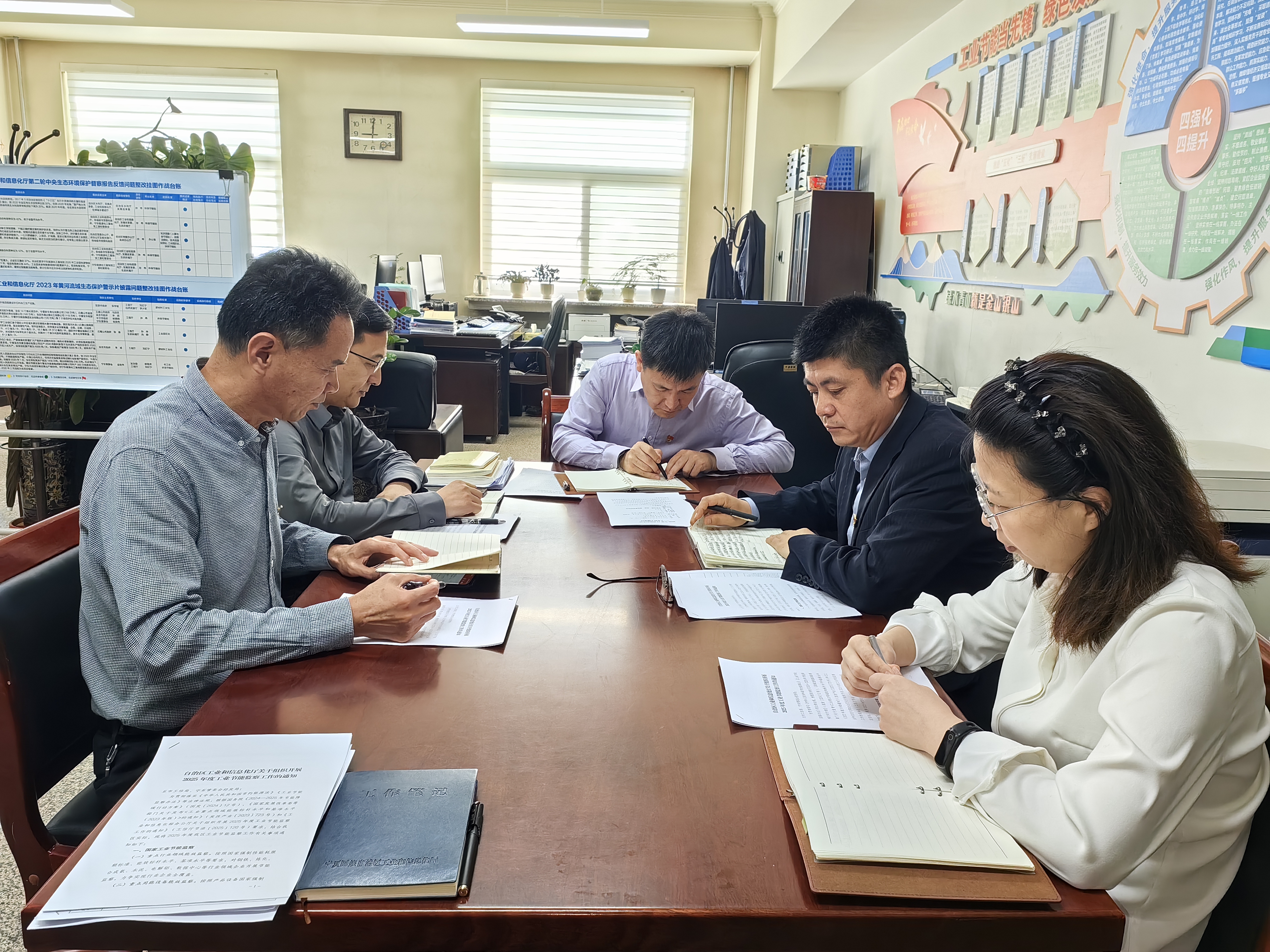 支部始终坚持“抓党建、带队建、促业务”,形成了“党建引领业务工作、业务体现党建成果”的良性互动局面。面对绿色发展、碳减排双控等新形势新要求,采取“请进来”与“走出去”结合,邀请权威专家解读前沿技术、最新政策,组织党员赴先进省份学习经验,举办工业节能降碳、绿色低碳发展研修班,覆盖重点企业骨干100余人次。支部党员化身“政策解说员”和“技术推广员”,点对点入企服务162户重点用能企业,手把手指导企业开展节能诊断,把政策条文变成企业听得懂的“操作指南”。聚焦稳增长促发展,党员干部合力攻坚,推动2024年底提前超额完成“十四五”规划工业能耗强度下降目标任务,2025年上半年完成39个固定资产投资项目节能审查,指导33家企业创建自治区级绿色工厂,累计建成199家绿色工厂、12家绿色园区,促使全区工业绿色发展的底色更足、覆盖更广。