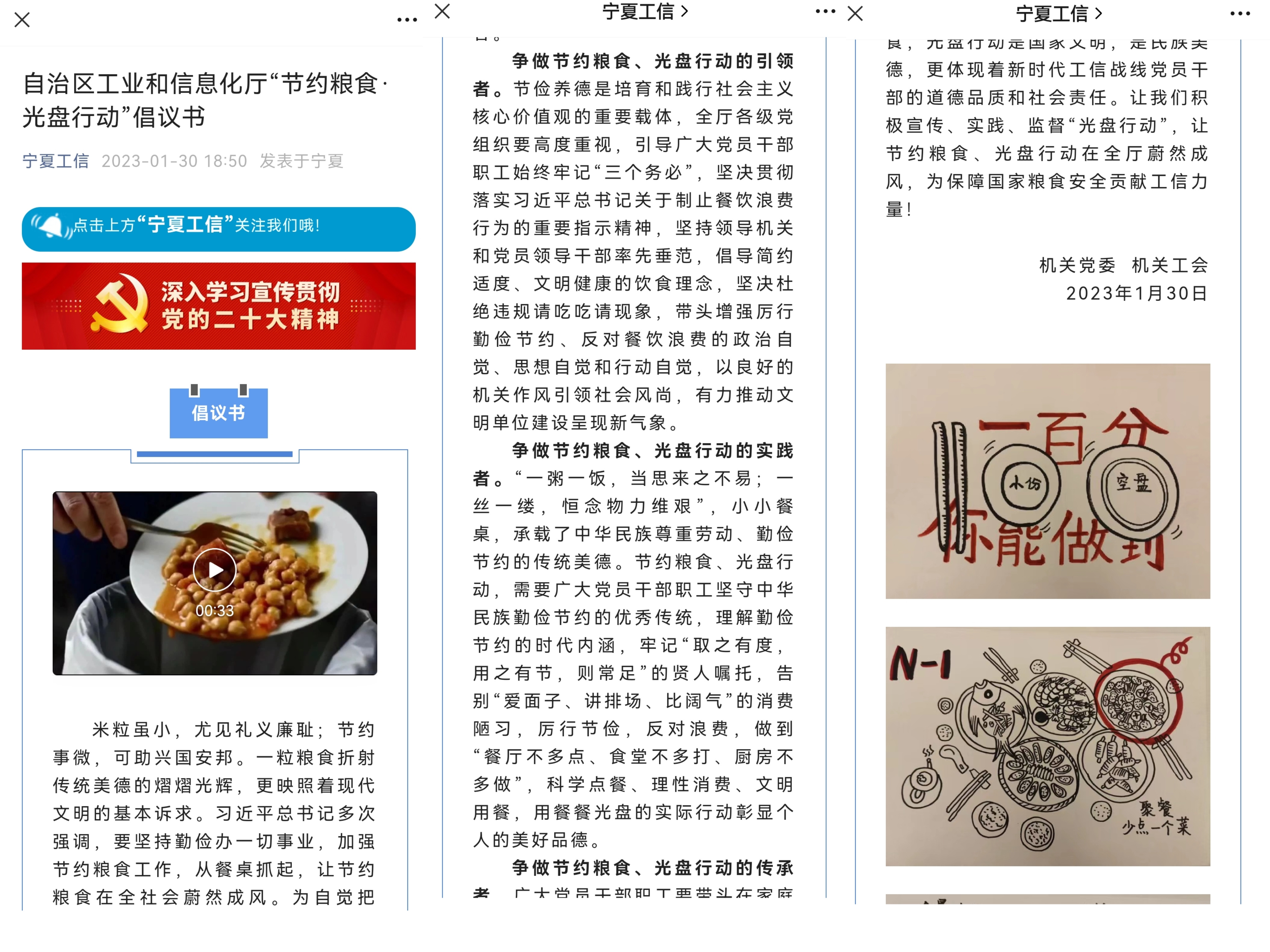 利用门户网站、微信公众号、微信群等网络平台,第一时间发布《捕鱼大咖 “节约粮食·光盘行动”倡议书》,教育引导广大干部职工争做勤俭节约的引领者、实践者和传承者。精心设计制作“节约粮食·光盘行动”宣传海报8幅,利用6台宣传电子屏在厅机关楼道内循环展播,时刻提醒干部职工厉行节俭,反对浪费,科学点餐、理性消费、文明用餐。编辑制作“节约粮食·光盘行动”宣传短视频,引导干部职工充分认识粮食安全的极端重要性,将艰苦朴素、勤俭节约的理念内化于心、外化于行。