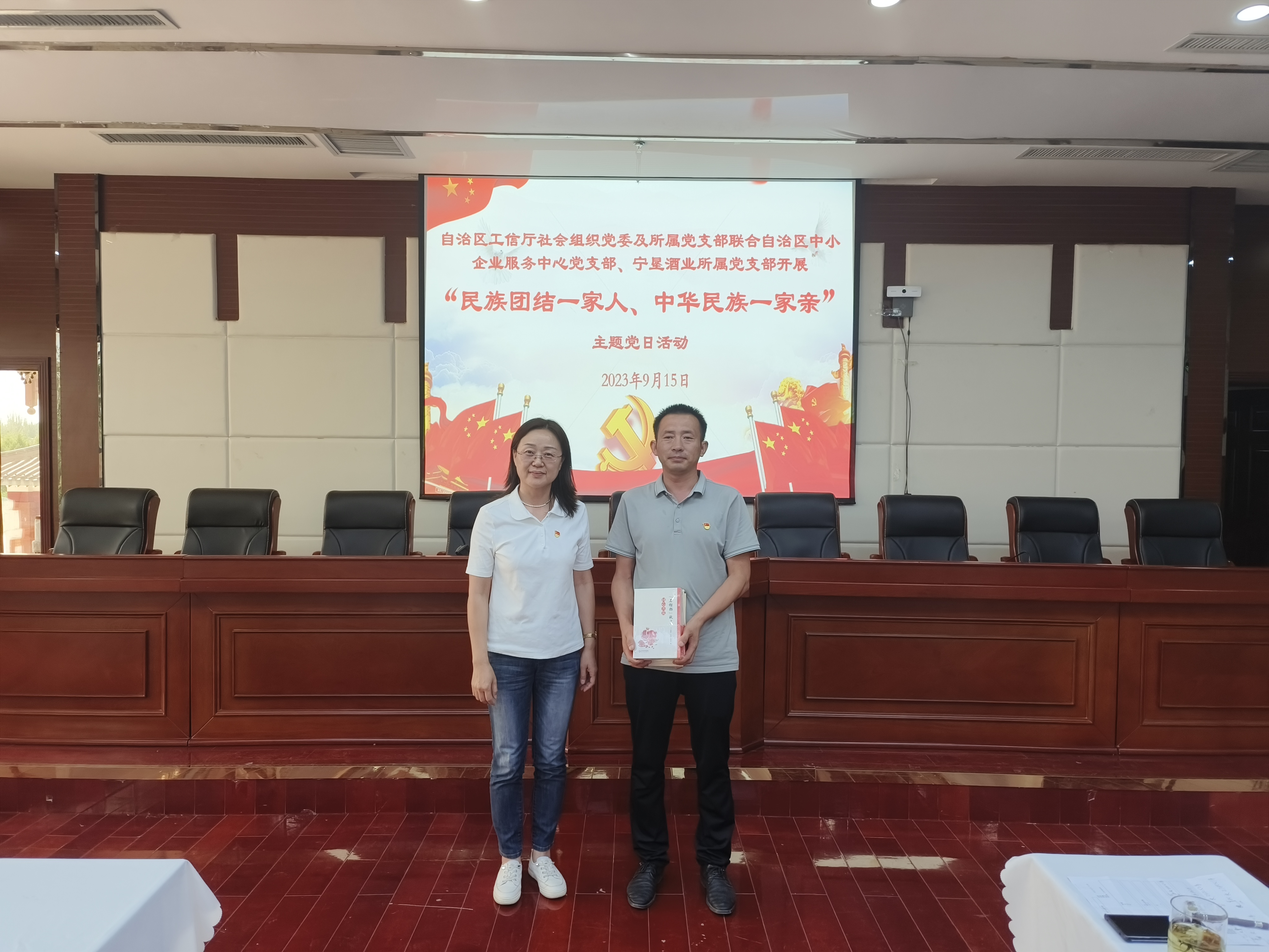 活动最后,自治区工业和信息化厅社会组织党委向宁夏农垦酒业有限公司赠送《石榴籽的故事》和《中央民族工作会议精神学习辅导读本》并组织开展了民族团结知识测试和团队建设活动。