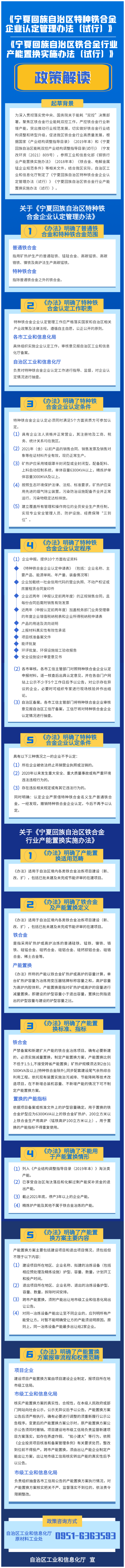 《宁夏回族自治区特种铁合金企业认定管理办法(试行)》《宁夏回族自治区铁合金行业产能置换实施办法(试行)》政策解读 发布日期:2022-07-25 17:10:00 上一条:一图看懂《宁夏回族自治区优质中小企业梯度培育管理实施细则》 下一条:最全!一图读懂2022年《政府工作报告》 扫一扫在手机打开当前页 打印关闭