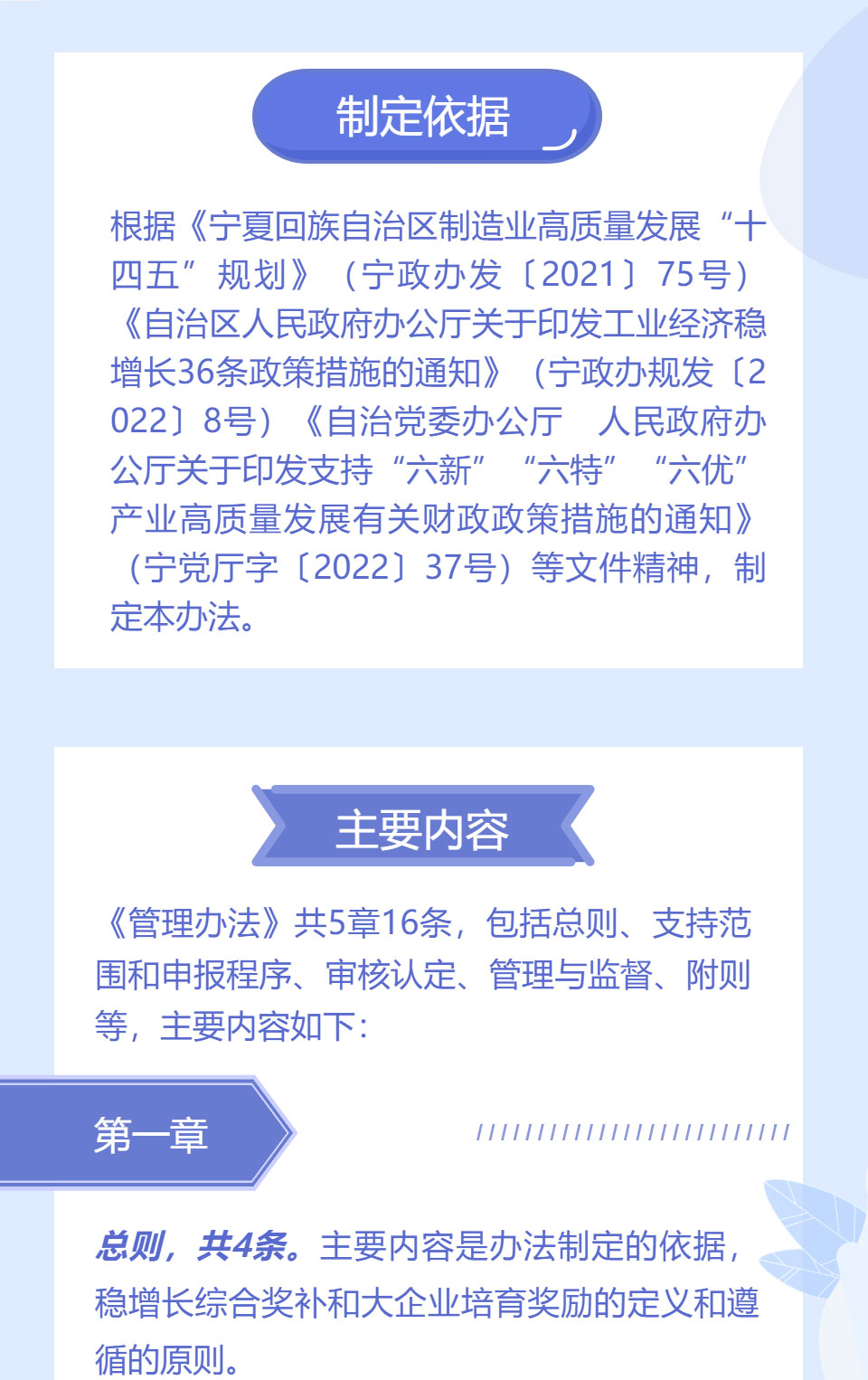 一图读懂《宁夏回族自治区稳增长综合奖补和大企业培育专项管理办法》 发布日期:2023-05-29 19:48:44 宁夏回族自治区稳增长综合奖补和大企业培育专项管理办法《宁夏回族自治区稳增长综合奖补和大企业培育 专项管理办法》政策解读 上一条:一图读懂《宁夏回族自治区新产品新标准专项管理办法》 下一条:一图读懂《宁夏回族自治区数字化车间、智能工厂和绿色工厂认定管理办法》 扫一扫在手机打开当前页 打印关闭