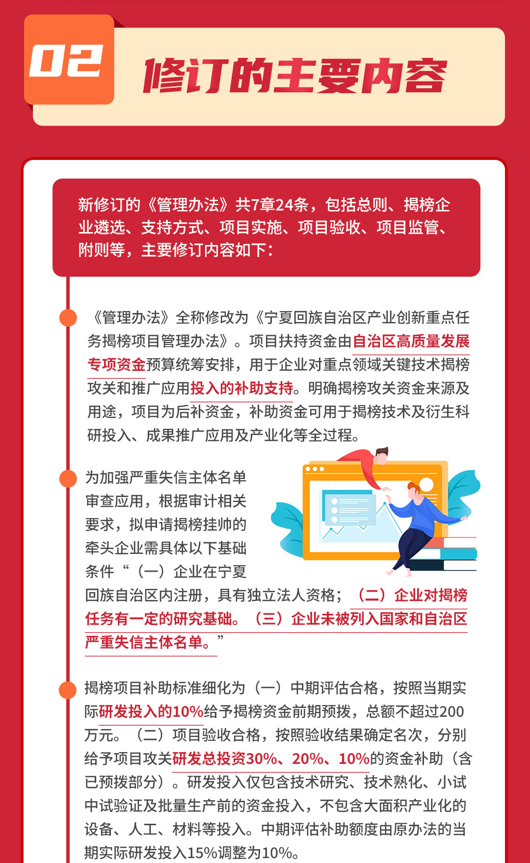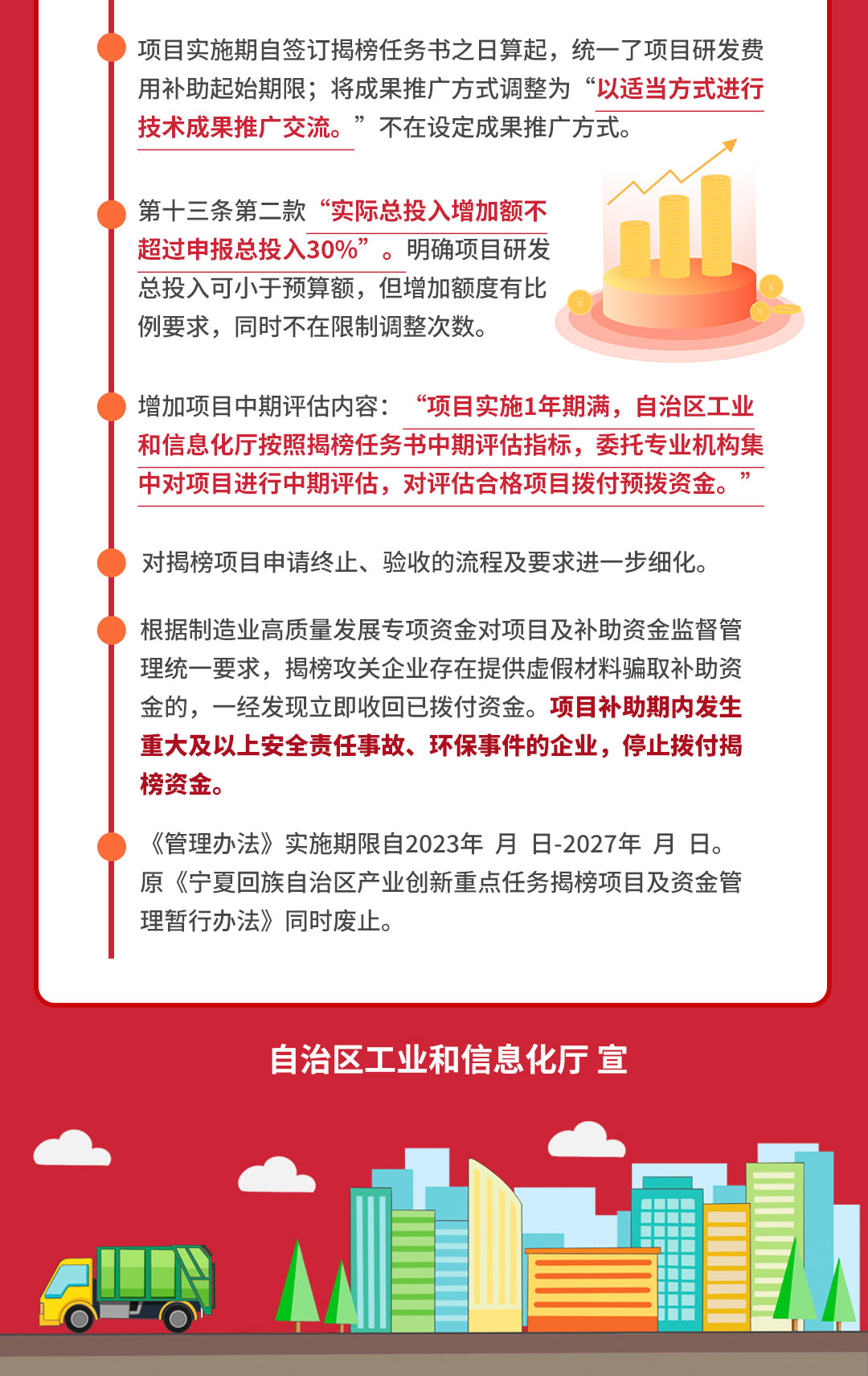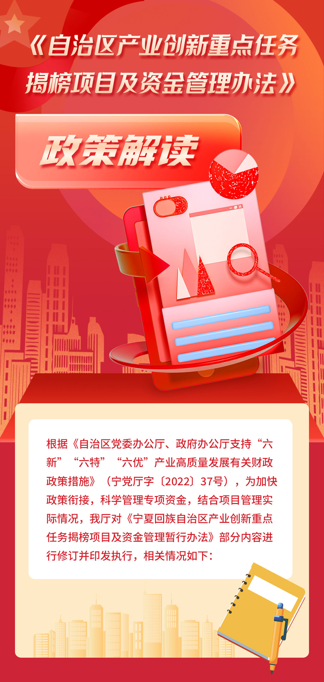 一图读懂 《自治区产业创新重点任务揭榜项目及资金管理办法》 发布日期:2023-05-29 20:26:57 宁夏回族自治区产业创新重点任务揭榜项目管理办法 上一条:一图读懂《宁夏回族自治区一般工业固体废物综合利用项目管理办法》 下一条:一图读懂《宁夏回族自治区制造业创新中心认定管理办法》 扫一扫在手机打开当前页 打印关闭