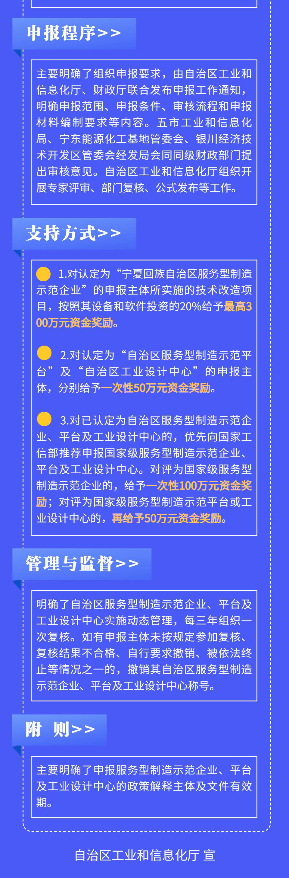 一图读懂《宁夏回族自治区服务型制造示范企业、平台及工业设计中心认定管理办法》 发布日期:2024-10-19 18:25:00 宁夏回族自治区服务型制造示范企业、平台及工业设计中心认定管理办法《宁夏回族自治区服务型制造示范企业、平台及工业设计中心认定管理办法》政策解读 上一条:一图读懂《捕鱼大咖 2023年政务公开要点》 下一条:一图读懂《宁夏回族自治区产业信息化项目管理办法》 扫一扫在手机打开当前页 打印关闭