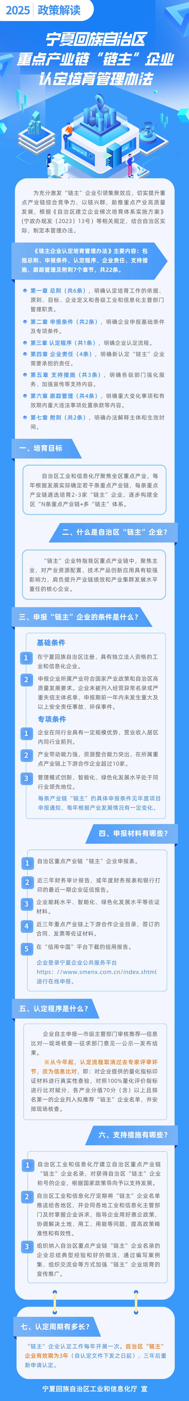 一图图解《宁夏回族自治区重点产业链“链主”企业认定培育管理办法》 发布日期:2025-04-07 09:11:00 自治区工业和信息化厅关于印发《宁夏回族自治区重点产业链“链主”企业认定培育管理办法》等项目管理办法的通知《宁夏回族自治区重点产业链“链主”企业认定培育管理办法》解读 上一条:一图图解《宁夏回族自治区企业技术中心认定管理办法》 下一条:一图图解《宁夏回族自治区行业领先企业认定管理办法》 扫一扫在手机打开当前页 打印关闭