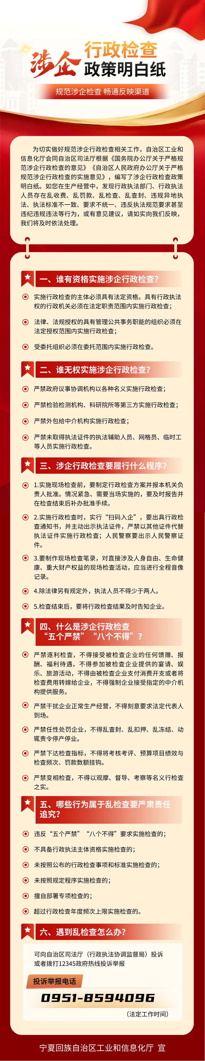 一图读懂《涉企行政检查政策明白纸》 发布日期:2025-08-15 08:53:52 国务院办公厅关于严格规范涉企行政检查的意见《国务院办公厅关于严格规范涉企行政检查的意见》有关问题解答 上一条:一图读解: 《宁夏回族自治区反间谍工作规定》 下一条:一图读懂《宁夏回族自治区卓越工程师实践基地和协同创新中心建设管理办法》 扫一扫在手机打开当前页 打印关闭