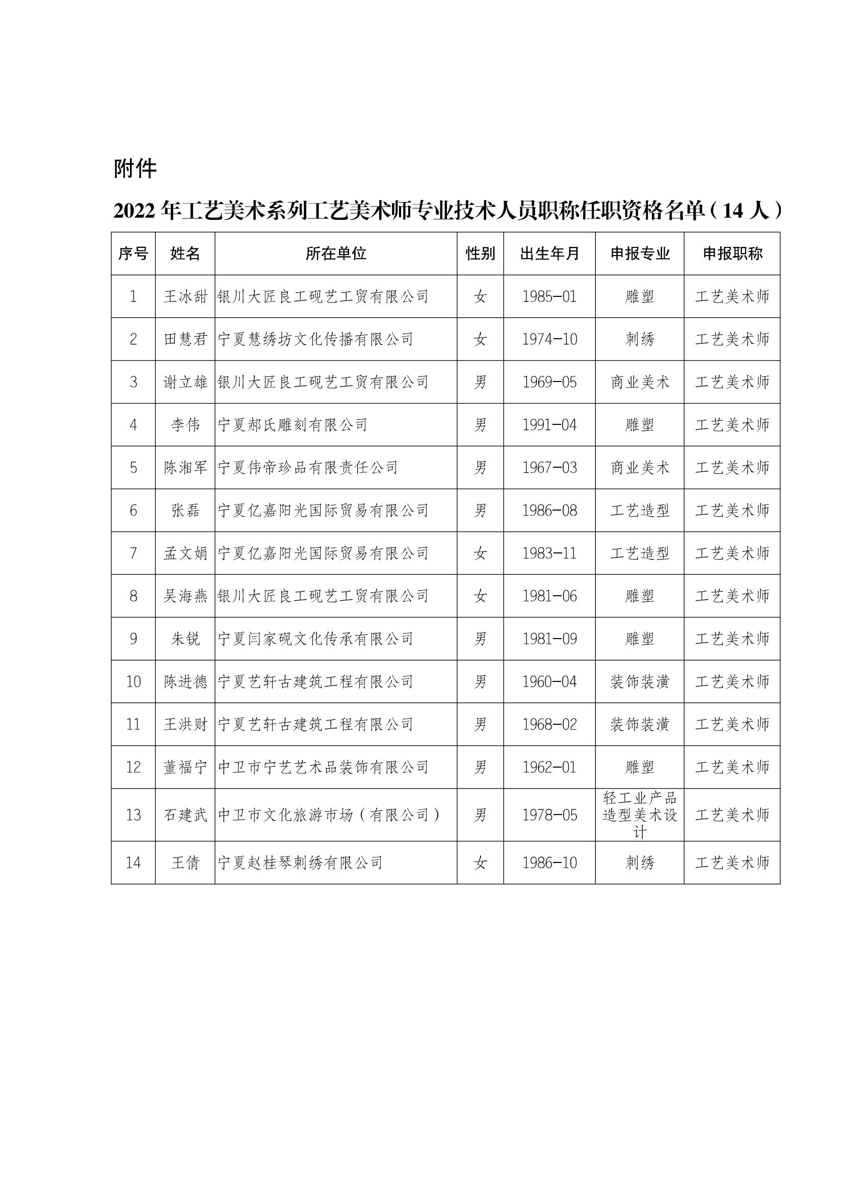 根据《宁夏回族自治区工艺美术系列专业技术职称评审条件(试行)的通知》(宁人社规字〔2020〕14号)、《自治区人力资源和社会保障厅关于做好2022年职称评审工作的通知》(宁人社函〔2022〕161号)、《捕鱼大咖 关于做好2022年工程技术系列建设工程专业、经济系列、工艺美术系列职称评审工作的通知》(宁捕鱼大咖 函〔2022〕138号)精神,经宁夏回族自治区工业和信息化厅工艺美术系列中级职称评审委员会评审,同意王冰甜等14人晋升工艺美术系列工艺美术师职称任职资格。任职资格时间从2022年11月20日计算。